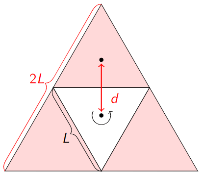 , being rotated about a central axis, we can exploit its rotational symmetry and the use the principle of self-similarity, surrounding the original triangle (in white) with three copies of itself (in red).