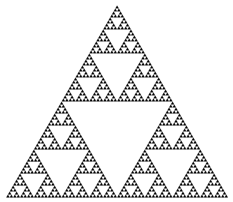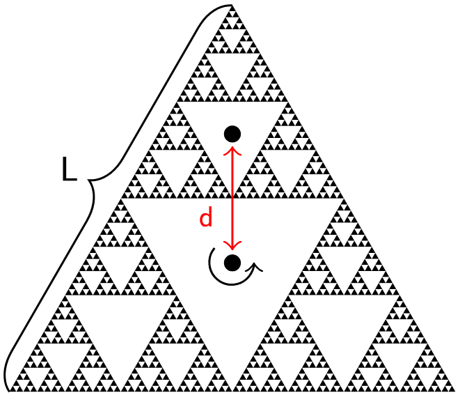 Note that the moment of inertia is larger than the MOI of an equilateral triangle with equivalent mass, which was , since in the fractal more of the mass is distributed far away from the axis of rotation!