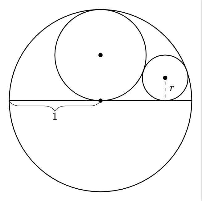 The first problem I chose was to find the radius r of the circle below. Note the large amount of tangency in the problem. The circles are tangent to each other, and the inner circles are tangent to the diameter of the unit circle.